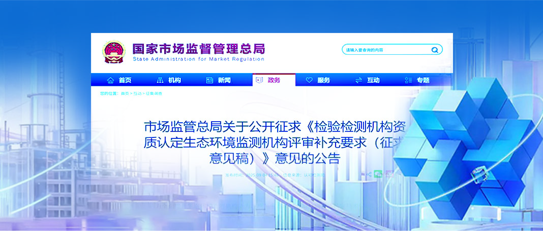 国家市场监督管理总局近期公布《检验检测机构资质认定生态环境监测机构评审补充要求(征求意见稿)》,面向社会公开征求意见...
